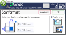 Om het scherm voor instellingen voor een aangepast formaat weer te geven, drukt u op het eerste scannerscherm op [Verzendinstellingen] > [Scanformaat] > [Aangep. formaat] > [Gedeeltelijke scan].