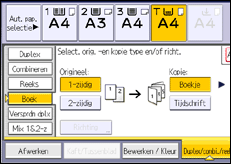 Met deze functie kopieert u vier enkelzijdige originelen of twee dubbelzijdige originelen in de juiste paginavolgorde voor een gevouwen boekje. Het apparaat selecteert een reproductieverhouding tussen 25% en 400% op basis van het formaat van het origineel en het papier. Als de richting van de originelen afwijkt van die van het kopieerpapier, draait het apparaat de afbeelding automatisch 90 graden om een goede kopie te kunnen maken. Om boekjes te maken die in paginavolgorde zijn, vouw dan ieder vel doormidden en stapel deze gevouwen vellen op.