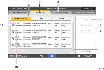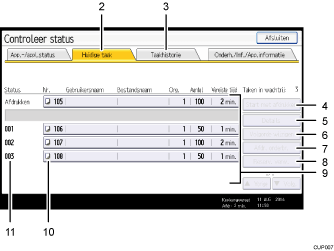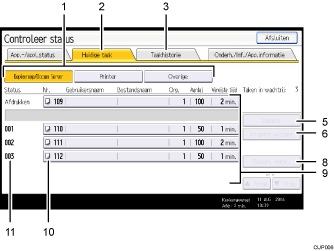 Opdrachten die afgedrukt worden in de kopieer-, Documentserver- of printermodus worden tijdelijk opgeslagen in het apparaat en dan op volgorde uitgevoerd. U kunt deze taken beheren in het scherm [Status controleren] of in het scherm [Takenlijst].