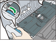 Open het deksel van de ADF en draai het blauwe wiel voor het verwijderen van vastgelopen papier vijf keer of vaker linksom.