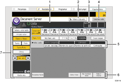 Esta pantalla aparece cuando pulsa [A pantalla escaneo] en la pantalla inicial de Document Server.