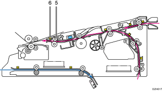 Nach der Korrektur der Hauptscan-Registrierung passiert das Blatt die Transfer-Timingwalze [5] und der Transfer-Timingsensor [6] erkennt dann die Vorderkante.