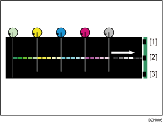 Lors du procédé d'ajustement de la qualité d'image, les schémas de toner dans 5 gradients sont créés sur l'ITB pour chaque couleur de toner et sont lus par les capteurs de marque de toner. Les conditions xérographiques sont ajustées conformément aux lectures du capteur, ce qui permet de maintenir un développement régulier (densité d'image max.).