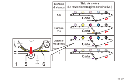 Per consentire la stampa in tutti e cinque i colori del toner e la stampa utilizzando solo il colore speciale, il meccanismo di contatto/separazione dell'ITB e dei rulli dell'ITB è stato modificato nel processo di trasferimento da tamburo a cinghia per la macchina. Tra le seguenti quattro modalità di stampa, la modalità corretta viene selezionata in base ai dati di stampa inviati dal controller della stampante.