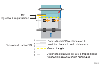 Quando la carta passa attraverso il registro meccanico, il CIS emette luce e legge la quantità di luce riflessa, per rilevare il bordo principale.