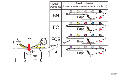 Con el fin de poder imprimir en los cinco colores del tóner, así como usando solamente colores especiales, el mecanismo para unir o separar los rodillos ITB y la ITB se ha modificado en el proceso de transferencia del tambor a la banda de la máquina. Entre los cuatro modos de impresión siguientes, el modo correcto se selecciona en función de los datos de impresión enviados desde el controlador de la impresora.