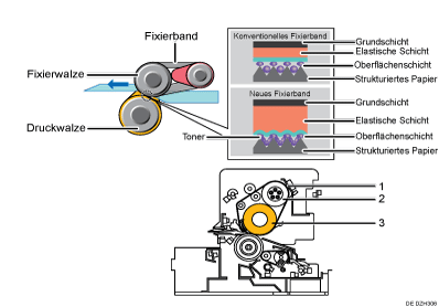 Das Fixierband hat eine dicke elastische Schicht, wie beim Vorgängermodell, mit dem es weiter in die Vertiefungen auf strukturierten Medien eindringen kann.