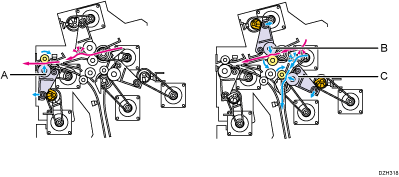 Der Glättungsdruckmotor [A] rotiert den Glättungsdruck-Nocken [B] und die Glättungsdruckwalze [C] drückt auf das Blatt.