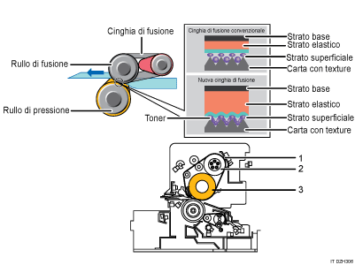 La cinghia di fusione ha uno strato elastico spesso, come nel modello precedente, per consentire alla cinghia di raggiungere le rientranze superficiali dei supporti con texture.