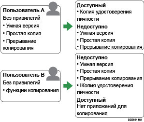В приведенном ниже примере пользователь В с ограниченными правами на использование функции копирования не может использовать все приложения копирования. Пользователь В без ограничения прав на использование функции копирования, но с правами на использование только приложения "Копия удостоверения личности", как это определено функцией аутентификации приложения, может использовать только приложение"Копия удостоверения личности".