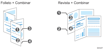 Cuando utilice las funciones de folleto o revista conjuntamente con la función combinar, podrá copiar varias hojas de un original en una única hoja de papel.