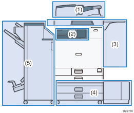 5 | Internal Finisher SR3250*1 | Clasifica, apila y grapa múltiples hojas de papel. Las copias pueden perforarse si se ha instalado la unidad de perforación opcional en el finisher. |