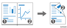 Hiermee worden de rechter- en linkerpagina's van een origineel met tegenover elkaar liggende pagina's of de voor- en achterkant van dubbelzijdige originelen op één kant van een vel gekopieerd (Reeks).