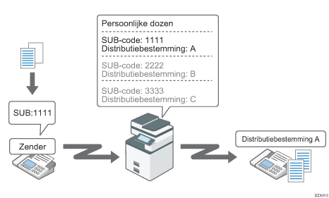 Voordat u faxen ontvangt in een persoonlijk postvak, moet u de afzender informeren over de SUB-code die geregistreerd staat voor het persoonlijke postvak. De ontvangen fax wordt toegewezen aan het persoonlijke postvak met de overeenkomende SUB-code.