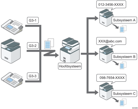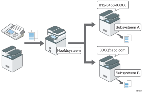 U kunt het subapparaat instellen waarop u een ontvangen fax wilt afdrukken bij de instellingen van het hoofdapparaat. De twee methodes om het afdrukken van faxen toe te wijzen aan een subapparaat zijn als volgt: