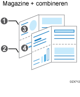 Plaats vier originele pagina's zoals hieronder weergegeven en druk ze af op een vel. Stapel alle bedrukte vellen en vouw ze dubbel om de pagina's te ordenen op volgorde van de paginanummers.