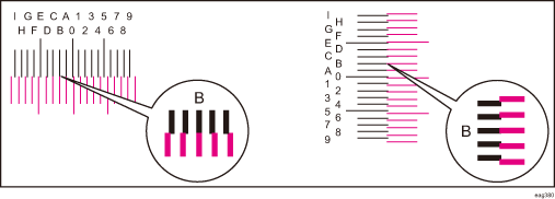 Pour chaque élément de la mire de test, vérifiez le chiffre ou la lettre ([I]-[9]) à l'endroit où les lignes supérieure et inférieure gauche et droite s'alignent précisément.