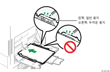 용지를 최대 적재 표시보다 많이 적재하지 마십시오. 한도 표시를 초과해 용지를 적재하면 인쇄된 이미지가 한쪽으로 치우치거나 용지 걸림이 발생할 수 있습니다.