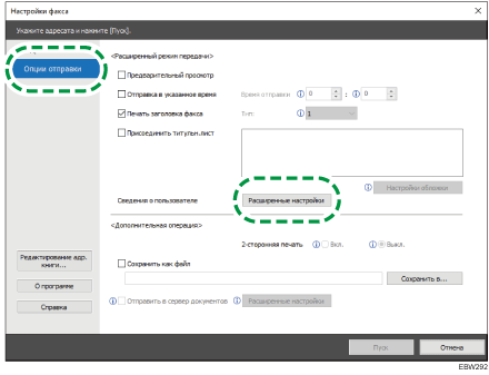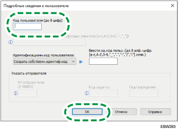 Если доступ к функции факса на аппарате ограничен аутентификацией по коду пользователя, задайте код пользователя для отправителя (8-значное число) с целью аутентификации заданий на передачу факсов с аппарата.