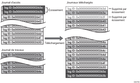 Si le nombre de journaux qui peuvent être sauvegardés dans l'appareil dépasse la limite et que de nouveaux journaux sont créés, les anciens journaux sont remplacés par les journaux plus récents. Si les journaux ne sont pas régulièrement téléchargés, il est possible que les anciens journaux ne puissent pas être enregistrés dans des fichiers.
