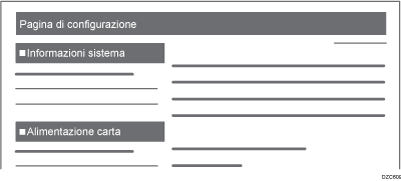 Nella pagina di configurazione, vengono stampate le informazioni relative a dispositivo, impostazioni carta dei vassoi, [Impostazioni Stampante] e configurazione di rete della macchina.
