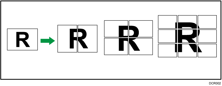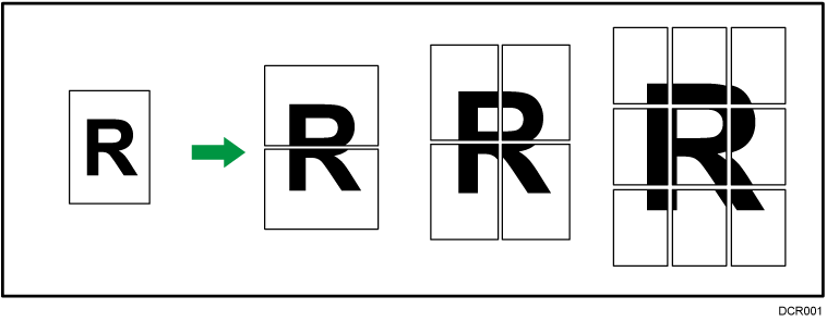 该功能允许对原稿进行拆分,并对每个部分进行放大,然后将其打印到多页纸张上,制作与海报同样大小的复印件。分割的图像打印时在每张纸的边缘上都留有 15 mm(0.59 英寸)的交叠,因此可以无缝粘贴它们。