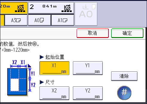 要指定需要消除的区域,必须在原稿上定义X1、Y1、X2和Y2的值。在输入区域设置之前,先请测量要指定的区域。