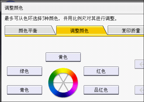 色彩平衡 注册自定义色彩 彩色校准 通过在色环中将特定颜色(黄色、红色、品红色、蓝色、青色和绿色)与邻近的颜色混合,可调整特定颜色。 最多可调整3种颜色。 按[编辑/颜色]。 按[彩色]。 按[调整颜色]。 按[调整颜色]。 选择要调整的颜色。 使用[]或[]调整色品。要更改两种或两种以上颜色,请重复步骤5至6。 按两次[确定]。 如果选择了[黑白],则不能使用该功能。如果选择了[黑白],请选择其他色彩模式。 在“自动清除”完成后,在按下[重设]时,或电源关闭时,调整的设置会被删除,各数值会被重置。