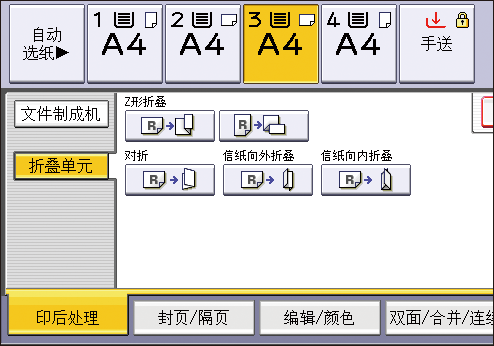可用的折叠功能取决于安装在您的机器上的印后处理器和折叠单元的类型。关于可用的印后处理器和折叠单元,请参阅您机器的“用户指南”。