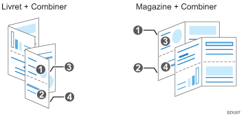 Lorsque vous associez la fonction Booklet ou Magazine à la fonction Combine, vous pouvez copier plusieurs feuilles d'un original sur une seule feuille de papier.