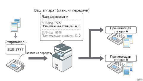 Помимо печати принятых факсов на аппарате, их можно перенаправлять на другой факс. Кроме того, с использованием кода SUB можно доставить принятый факс нескольким адресатам или различным адресатам путем циркулярной передачи в зависимости от линии, по которой был принят факс.