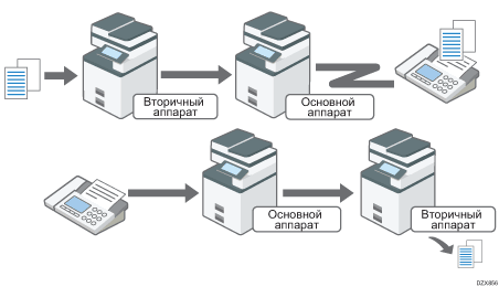 Используя функцию факса основного аппарата, можно отправлять и принимать факсы с устройства (вспомогательного аппарата), не имеющего функции факса. Используйте окно "Удаленный факс" вспомогательного аппарата для отправки факса с основного аппарата или печати факса, принятого на основном аппарате, со вспомогательного аппарата. Эту функцию можно использовать только на наших МФУ.