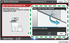 Empty the hole punch receptacle by following the procedure described in the animated illustration displayed on the control panel.
